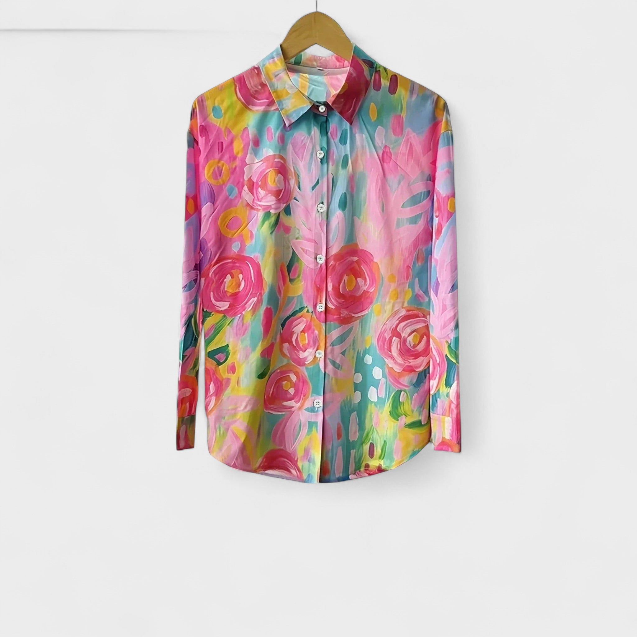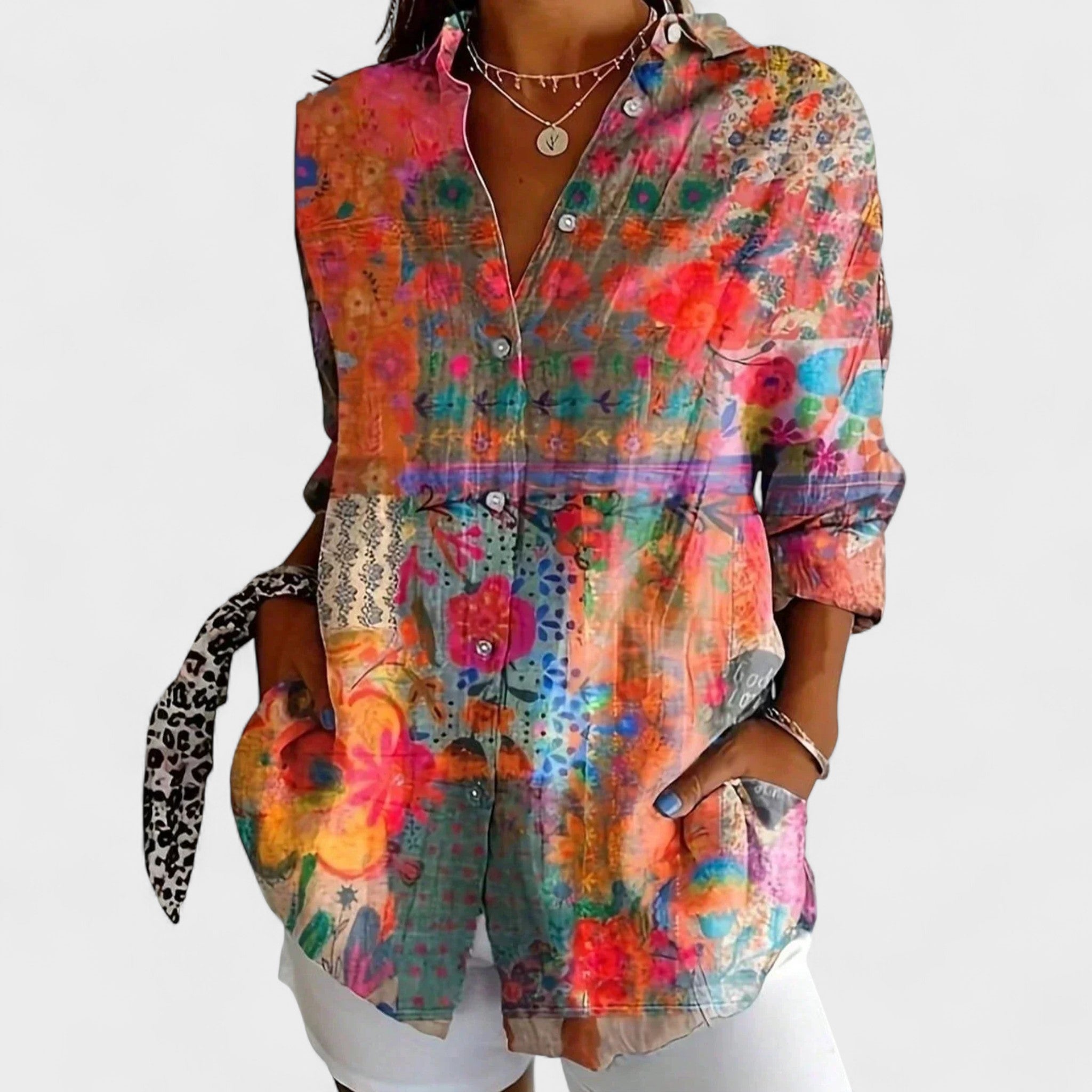 Leichte, moderne und vielseitige Bluse, die Komfort und Eleganz in jedem Detail vereint. Ihr künstlerisches Muster verwandelt selbst die einfachste Kombination in ein Outfit voller Persönlichkeit und Stil. Perfekt für entspannte Momente, aber auch für Anlässe, bei denen Sie ohne viel Aufwand glänzen möchten.
