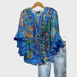 Heben Sie Ihren künstlerischen Stil mit dieser Bluse in intensivem Blau hervor, die mit bunten abstrakten Mustern und Details verziert ist, die an eine Malleinwand erinnern. Die Rüschärmel verleihen Eleganz und Bewegung, während die zarte Silhouette diese Bluse ideal für den Alltag und besondere Anlässe macht.