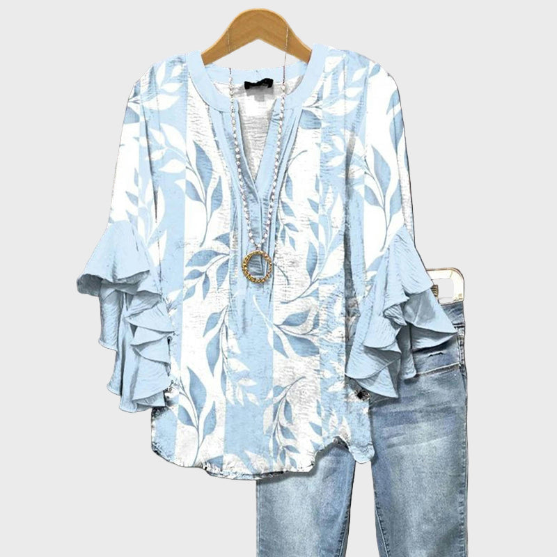 Frischen Sie Ihren Sommerstil mit dieser Bluse in Blauton auf, die mit eleganten weißen Blättern verziert ist. Romantische Details an den voluminösen Ärmeln verleihen Bewegung und Weiblichkeit, während der bequeme Schnitt Leichtigkeit und Eleganz für jeden Moment des Tages bietet.