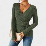 Elegantes Langarmshirt mit V-Ausschnitt und Wickeleffekt, der die Taille betont. Das gerippte, weiche und dehnbare Material schmiegt sich an den Körper, ohne einzuengen, während subtile Falten und seitliche Knöpfe einen raffinierten, femininen Look kreieren. Lässt sich leicht mit Jeans, Röcken oder Blazern kombinieren – ideal für die Arbeit, Ausgehen oder den Alltag.