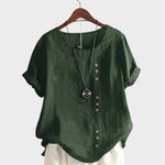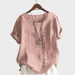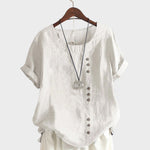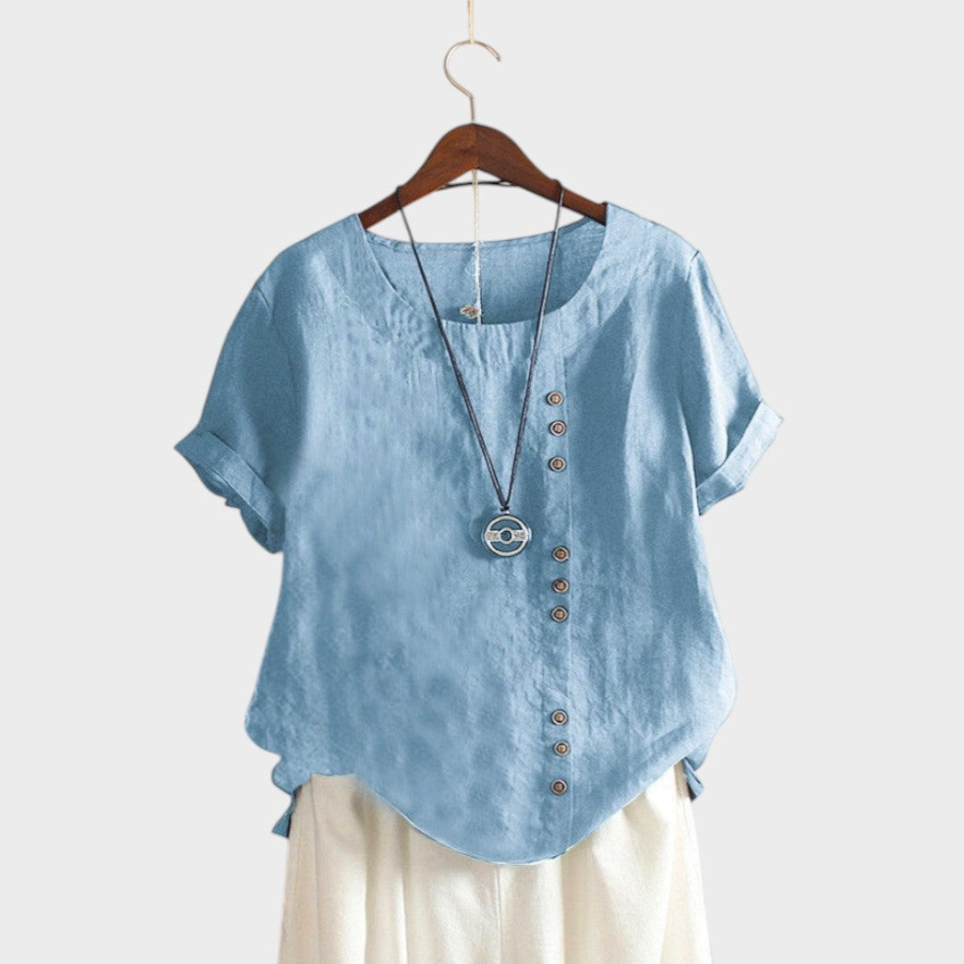 Diese Bluse bringt die perfekte Balance zwischen Lässigkeit und Eleganz. Die asymmetrische Anordnung der Knöpfe verleiht ihr ein modernes und besonderes Aussehen, während das leichte Material für Atmungsaktivität und Komfort den ganzen Tag sorgt. Sie ist ideal für alltägliche Kombinationen, aber auch für besondere Anlässe, wenn Sie anders und raffiniert aussehen möchten.