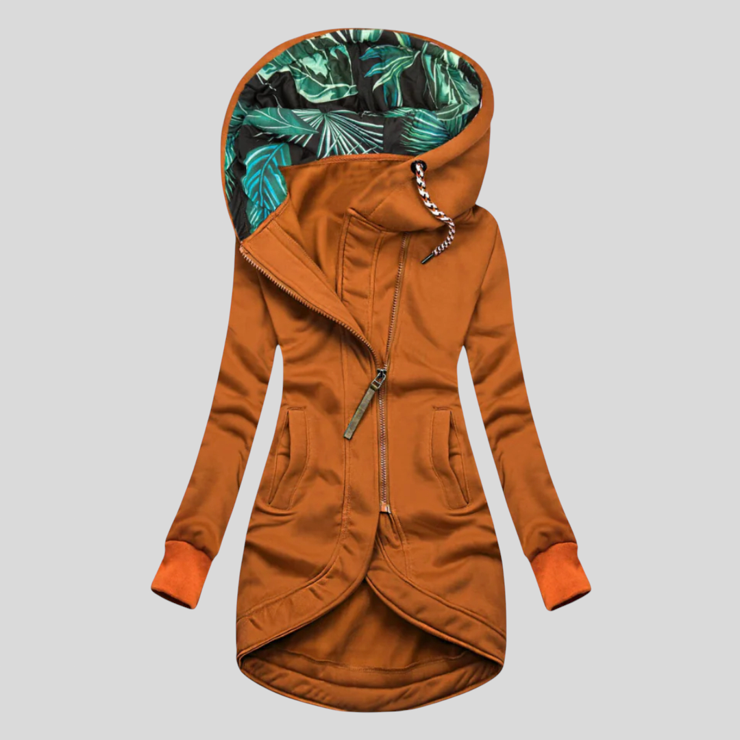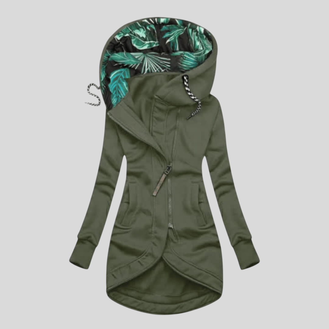 Frische deinen Stil mit dieser Jacke im modernen Schnitt und makelloser Verarbeitung auf. Das asymmetrische Design in Kombination mit einer Kapuze, die mit einem tropischen Muster gefüttert ist, verleiht jedem Outfit ein einzigartiges und authentisches Aussehen. Perfekt für diejenigen, die Komfort, Praktikabilität und Eleganz im Alltag suchen.