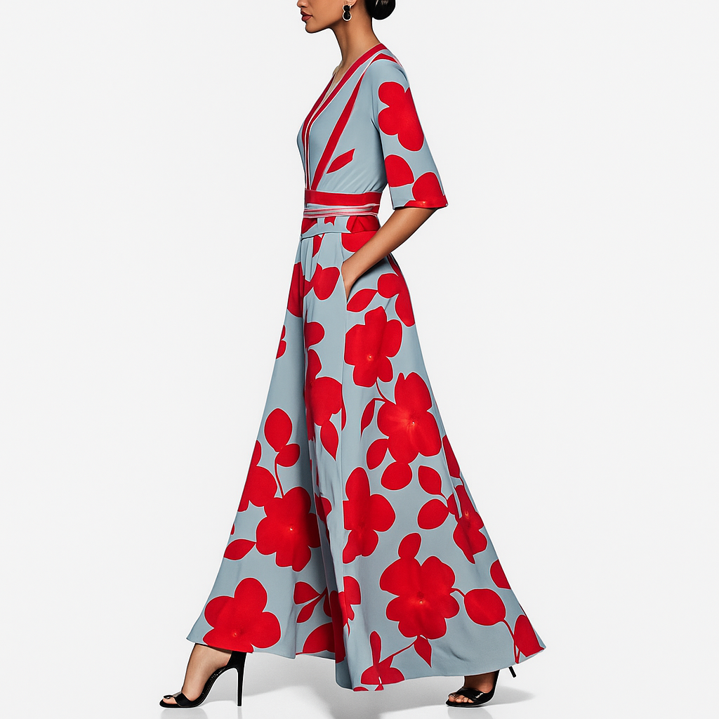 Aufsehenerregendes Maxikleid mit tiefem, überlappendem V-Ausschnitt und Kimono-Ärmeln, das eine raffinierte, verlängerte Silhouette kreiert. Der betonte Gürtel definiert die Taille, während der üppige, schwingende Rock mit vorderem Schlitz bei jedem Schritt dramatische Bewegungen erzeugt. Praktische seitliche Taschen sind diskret in der Naht versteckt und bieten eine Prise alltäglicher Funktionalität. Ideal für Hochzeiten, Cocktails und alle besonderen Anlässe, wenn du einzigartig aussehen möchtest.