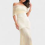 Dieses lange Kleid aus Strick ist eine Ode an elegante Sinnlichkeit. Mit freigelegten Schultern und tailliertem Schnitt passt es perfekt zum Körper, während der transparente Rock jeder Bewegung Fluidität und Raffinesse verleiht. Es ist die ideale Wahl, um bei besonderen Anlässen mit einem modernen und mutigen Look aufzufallen.