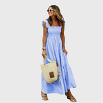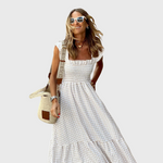 Bringen Sie einen Hauch von Frische und Verspieltheit in Ihren Sommerkleiderschrank mit diesem wunderschönen Maxikleid im blau-weißen Karomuster. Das Smock-Oberteil passt perfekt und betont die Taille, während der leichte und luftige Stoff maximalen Komfort an heißen Tagen bietet. Das Kleid lässt sich leicht mit Sandalen, einem Hut oder einer geflochtenen Tasche kombinieren, um einen perfekten Casual-Chic-Look zu erzielen.