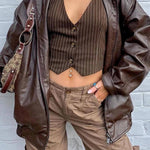 Vă prezentăm geaca noastră Lilli, realizată din piele sintetică pentru un echilibru perfect între stil și funcționalitate. Această geacă are un guler înalt cu nasture, fiind perfectă pentru utilizarea zilnică. Cu o estetică primăvăratică, de toamnă și iarnă, se potrivește fără efort cu look-ul tău, fie că ești afară pentru o zi informală sau te îmbraci în straturi pentru vremea mai rece. Îmbunătățește-ți colecția cu acest element esențial pentru sezonul acesta.