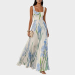 Ein langes Kleid, das Romantik und Raffinesse vereint. Der quadratische Ausschnitt mit breiten Trägern betont das Dekolleté, die definierte Taille formt die Figur, und der plissierte Rock sorgt für einen fließenden Fall, der jeden Schritt begleitet. Hergestellt aus leichtem,柔igem Material für ganztäglichen Komfort, mit einem botanischen Muster, das einen frischen, schicken Eindruck vermittelt. Ideal für Hochzeiten, Abendessen, Reisen und Veranstaltungen im Freien — der Look ist bereit mit Sandalen und einer Clutch.