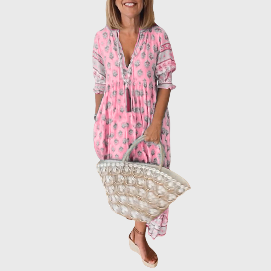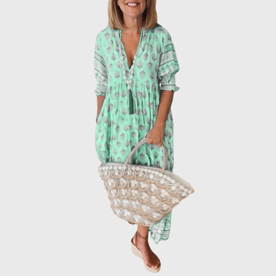 Dieses Boho-Kleid bringt Leichtigkeit und Unbeschwertheit in Ihren Stil. Der fließende Schnitt mit V-Ausschnitt und Details an den Ärmeln bietet die perfekte Balance zwischen Komfort und Weiblichkeit. Es ist ideal für sommerliche Spaziergänge, Urlaub am Meer oder Treffen mit Freunden, und das luftige Material macht es zu einer hervorragenden Wahl sowohl für warme Tage als auch für entspannte Abende.