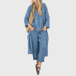 Dieses Set aus leichtem Leinen ist die perfekte Wahl für Frauen, die eine Kombination aus Eleganz und Lässigkeit lieben. Es besteht aus weiten Hosen, einer bequemen Bluse und einem langen, leichten Mantel, der dem Alltagslook eine raffinierte Note verleiht. Das atmungsaktive Material sorgt für ein angenehmes Tragegefühl, und das vielseitige Design macht es ideal für die Stadt und den Urlaub.