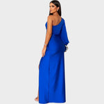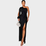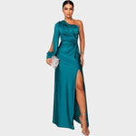 Dieses Abendkleid strahlt Raffinesse und modernes Design aus. Der asymmetrische Schnitt mit einem Ärmel und das effektvolle Raffungselement in der Taille betonen die feminine Silhouette, während der tiefe Schlitz eine Prise Sinnlichkeit und Eleganz hinzufügt. Es ist ideal für festliche Anlässe, Gala-Dinner oder besondere Events, bei denen Sie strahlen und einen unvergesslichen Eindruck hinterlassen möchten.