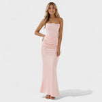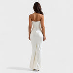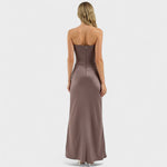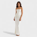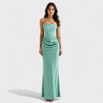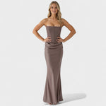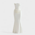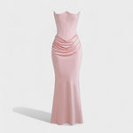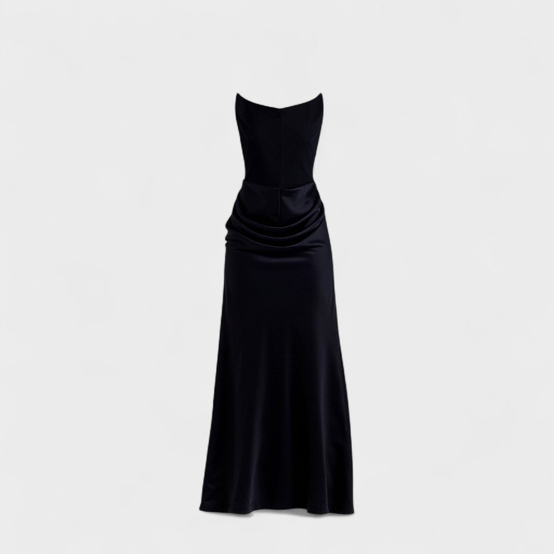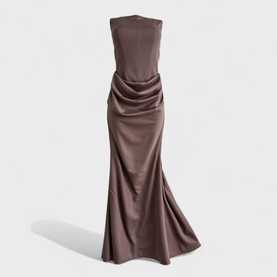 Das Kleid 'Radmila' verkörpert zeitlose Eleganz in ihrer schönsten Form. Dieses bodenlange Kleid hat einen trägerlosen Bustier-Stil, gefertigt aus mattem Material, das eine perfekte Grundlage bietet, während die kunstvollen Falten im Hüftbereich beneidenswerte Kurven schaffen. Die maßgeschneiderte Silhouette geht in ein subtil auslaufendes Fischschwanzdesign aus glänzendem Satin über, das jeden Schritt besonders macht.