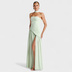Das perfekte Kleid, um alle Blicke auf sich zu ziehen und bei jedem Schritt zu begeistern. Ihr trägerloser Ausschnitt und der seitliche Schlitz kombinieren Sinnlichkeit und Raffinesse, ideal für Veranstaltungen, bei denen sie im Mittelpunkt steht.