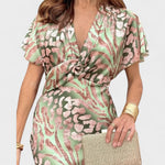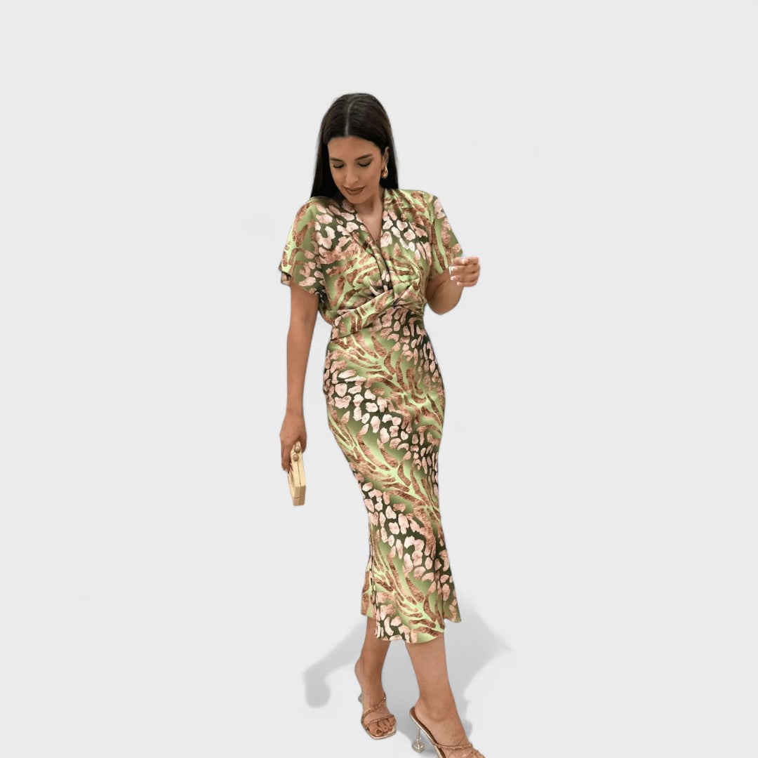 Ein raffiniertes Midi-Kleid mit luftigen Ärmeln und einem drapierten V-Ausschnitt, der sanft das Dekolleté betont. Der Stoff mit feinem Glanz und dekorativem Muster fällt elegant über den Körper, während die definierte Taille die feminine Silhouette formt. Der leicht auslaufende Saum ermöglicht einen grazilen Gang – ideal für Hochzeiten, Cocktails und alle besonderen Anlässe.